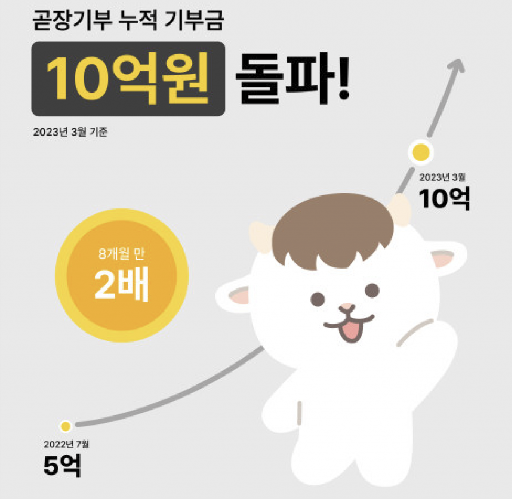 2020년 시작한 곧장기부는 2년 차인 2021년 누적 기부금 2억5000만원을 돌파했고 지난해 7월 5억원을 넘었다. 곧장기부가 지난해까지 후원받은 전체 누적 금액은 7억5000만원에 달한다. 이 가운데 5억원은 2022년에만 모금된 금액이다.