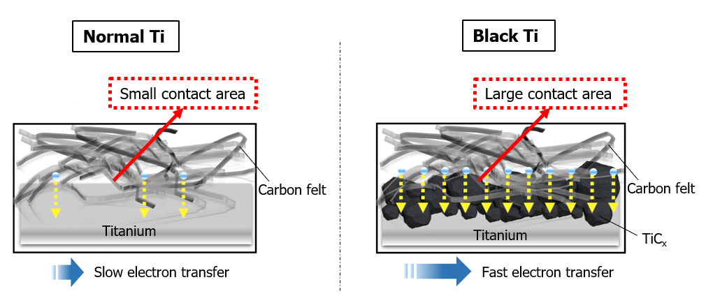 기존의 티타늄 (Normal Ti)을 쓴 경우와 TiC를 코팅한 티타늄 (Black Ti)를 쓴 경우 배터리 전자 이동 비교.
