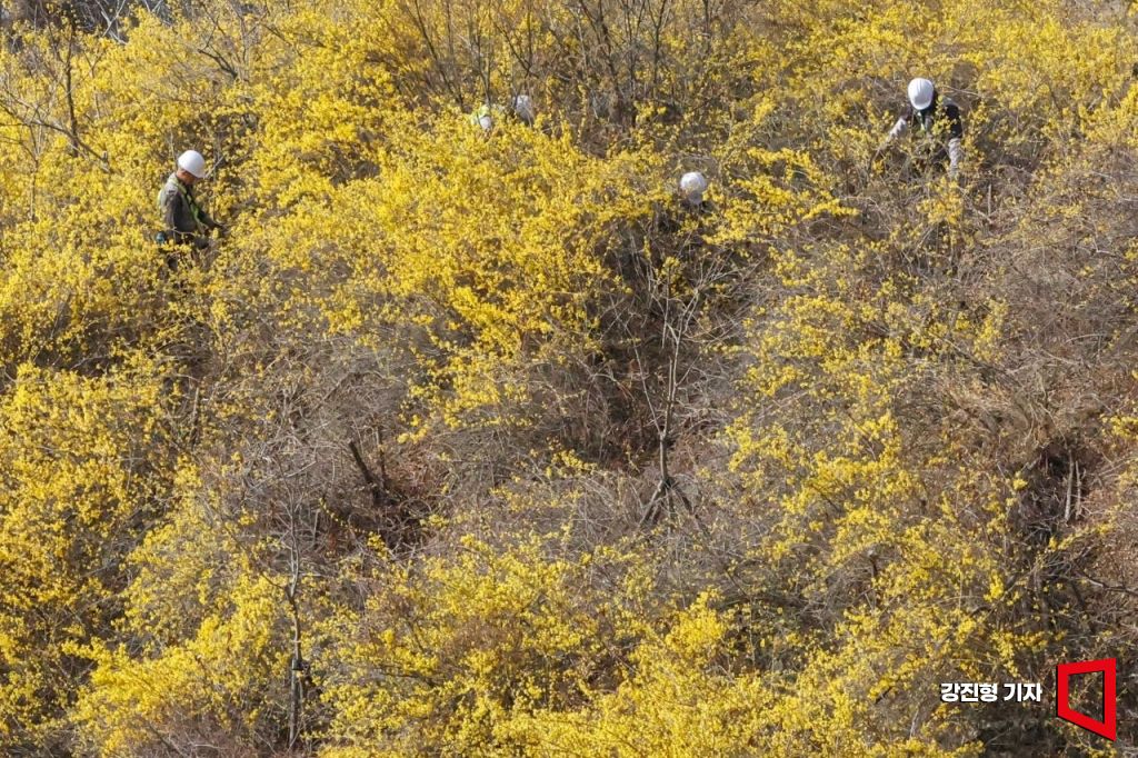절기상 '춘분'인 21일 서울 성동구 응봉산에 개나리가 활짝 피어 있다.