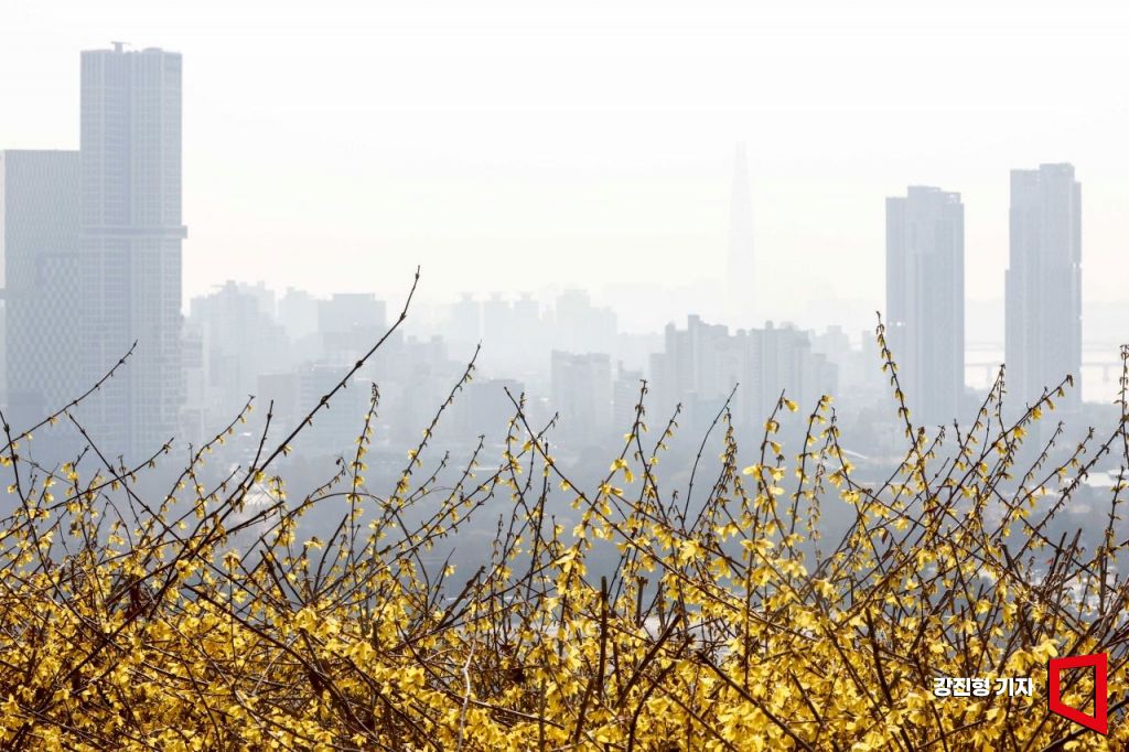 절기상 '춘분'인 21일 서울 성동구 응봉산에 개나리가 활짝 피어 있다.