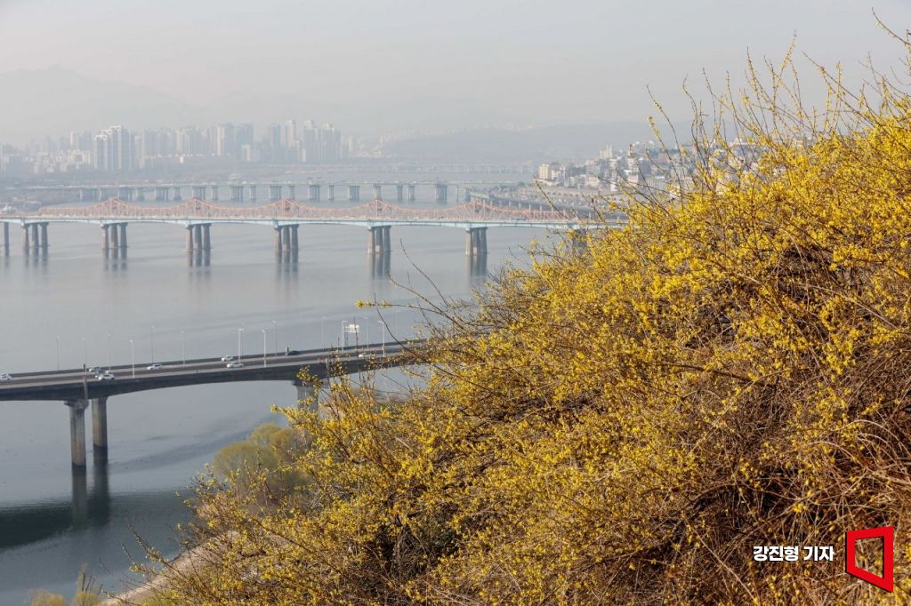 절기상 '춘분'인 21일 서울 성동구 응봉산에 개나리가 활짝 피어 있다.