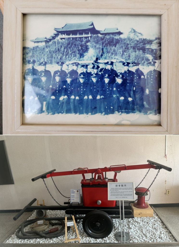 소방 유물인 소방공무원 사진(위)과 소방완용펌프. [사진제공=경남소방본부]