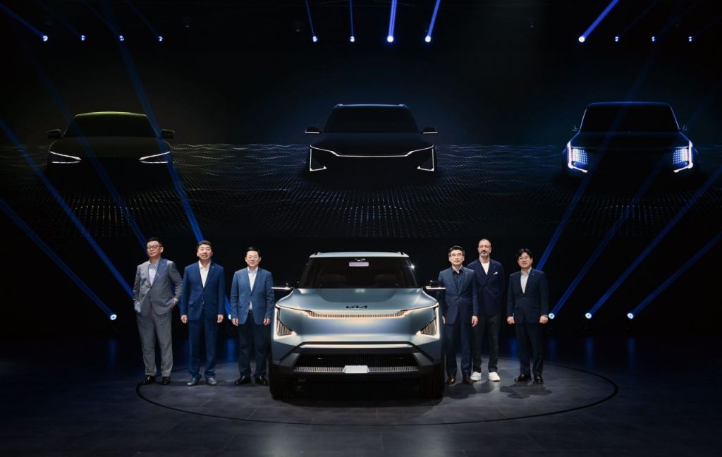 양홍하이 기아 중국법인 COO(왼쪽부터), 김경현 기아 중국법인 총경리, 장나이원 기아 중국법인 동사장, 송호성 기아 사장, 카림 하비브 기아 글로벌디자인센터 부사장, 이태훈 글로벌사업관리본부 전무 등 경영진이 콘셉트 EV5와 함께 포즈를 취하고 있다. 사진제공=기아