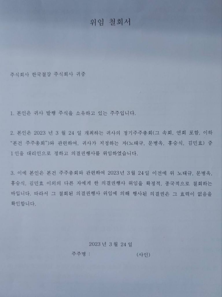 21일 증권 업계에 따르면 키스코홀딩스와 한국철강은 '한국 M&A'라는 의결권 위임 대리 업체를 고용하고, 개인 주주들로부터 주총 날짜가 기재된 '위임 철회서'를 받는 중이다.
