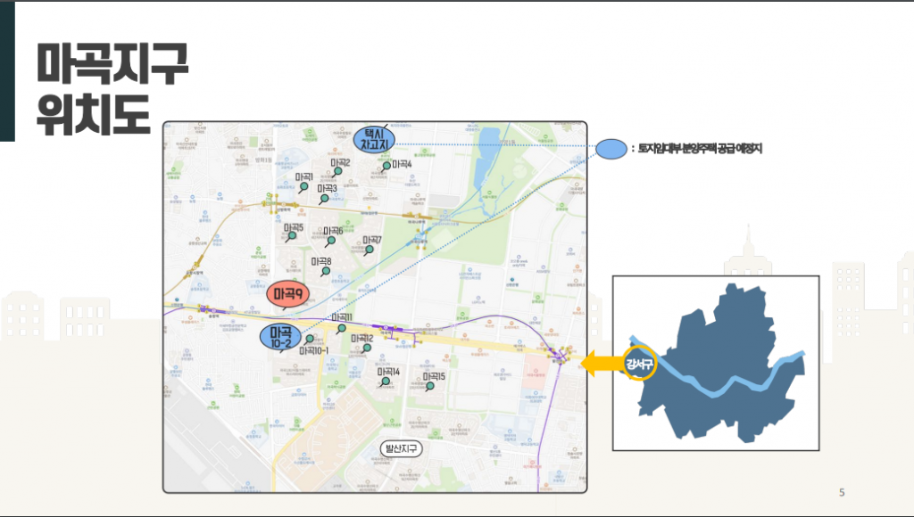 21일 서울주택도시공사(SH공사) 대회의실에서 열린 마곡지구 9단지 분양원가 공개 설명회에 소개된 마곡지구 토지임대부 분양주택 예정지 위치도 [자료제공=SH공사]