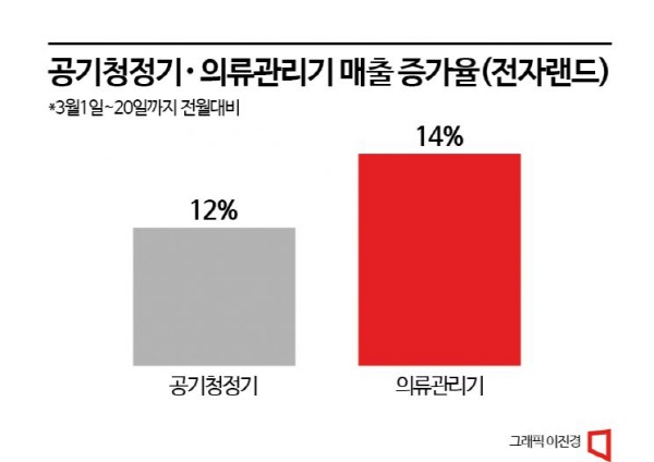 22일 롯데하이마트에 따르면 이달 14일부터 20일까지 공기청정기 매출이 전월 대비 10% 증가했다. 전자랜드에서는 이달 1일부터 20일까지 공기청정기 판매가 지난달보다 12%, 의류관리기는 14% 늘었다.