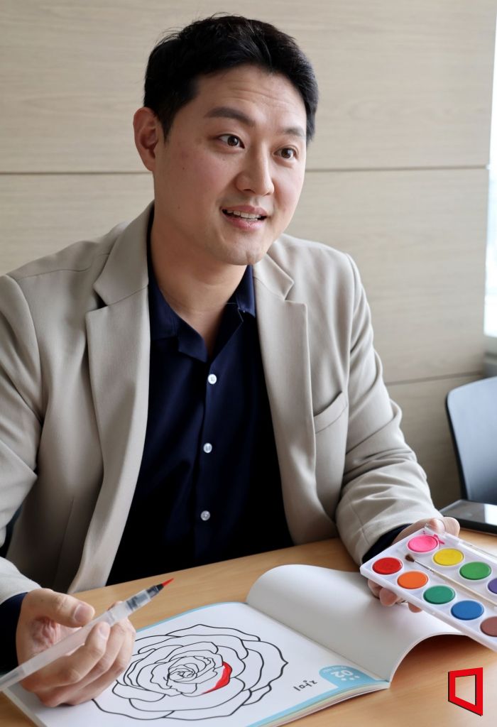민트웨이 이오상 대표가 경도인지장애나 초기 치매 어르신들을 위한 그림 교육 프로그램에 쓰이는 향기나는 물감과 워터브러시를 보여주며 이야기하고 있다. . 사진=허영한 기자 younghan@