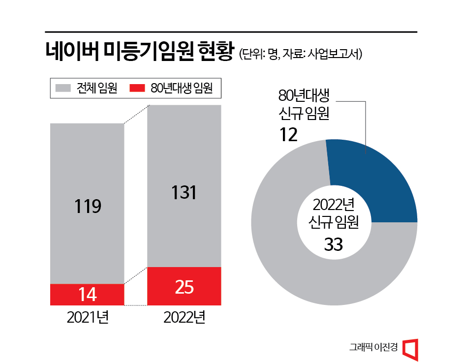 새로 선임된 책임리더 가운데 1980년대생은 12명으로 36%를 차지했다. 책임리더를 포함한 미등기임원 131명 가운데 1980년대생이 총 25명인데 이 중 절반 정도가 최 대표 취임 이후 신규 임원에 오른 것이다. 이에 따라 전체 임원 중 1980년대생 비중도 늘었다. 최 대표 취임 직전인 2021년 11%에서 지난해 19%로 증가했다.