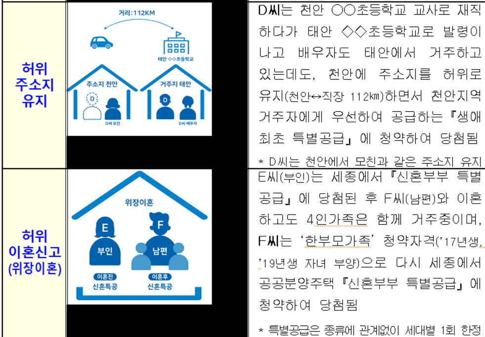 특별공급 횟수 제한 또는 재당첨 제한을 회피하기 위해 허위로 이혼(실제는 함께 거주)하고 청약하는 방식의 부정 청약도 3건이 드러났다. 특별공급은 세대별 1회로 한정되며 분양가상한제 주택 당첨 세대는 10년간 재당첨이 제한된다. 또 청약 제한사항을 회피하기 위해 혼인(동거 및 자녀 양육)하고도 혼인신고 없이 별도 가구로 가장해 청약하는 방식의 부정 청약도 6건으로 조사됐다.