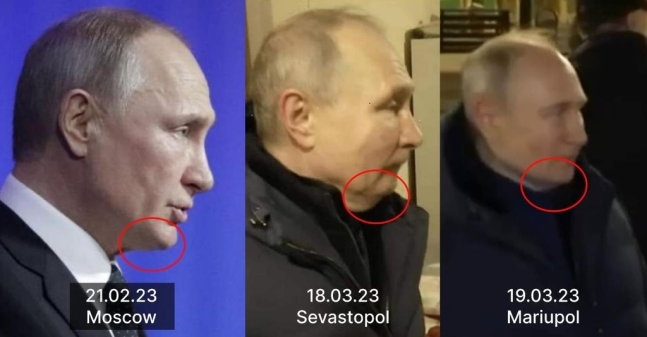 안톤 보좌관은 푸틴 대통령의 턱 모양에 주목했다. 모스크바에서 찍힌 사진의 경우 턱이 앞으로 도드라져 있으나, 지난 18일 세바스토폴 사진에서는 무턱에 가까웠다. 반면 19일 찍힌 마리우폴 사진에서 푸틴 대통령의 턱은 비교적 각지고 뾰족한 모습을 보였다. 안톤 보좌관은 사진과 함께 "어느 쪽이 진짜라고 생각하는가"라고 썼다.