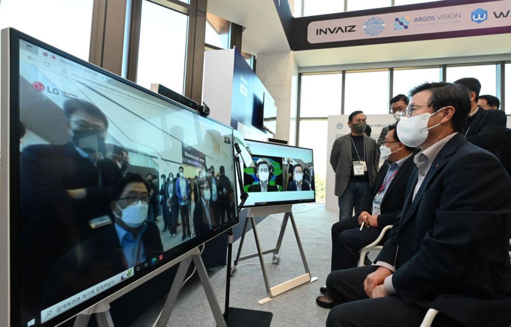장익환 LG전자 BS사업본부장 부사장이 작년 11월2일 서울 강서구 마곡 사이언스파크에서 열린 '비즈노베이터 2022' 성과공유회에서 스타트업 기술을 점검하는 모습.[이미지 출처=연합뉴스]