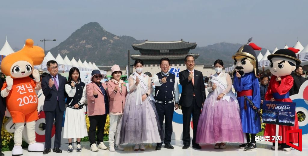 한덕수 국무총리가 22일 서울 광화문광장에서 열리고 있는 '전라남도 방문의해 서울페스티벌' 행사에 참석, 김영록 전남 도지사와 기념촬영을 하고 있다. 사진=윤동주 기자 doso7@