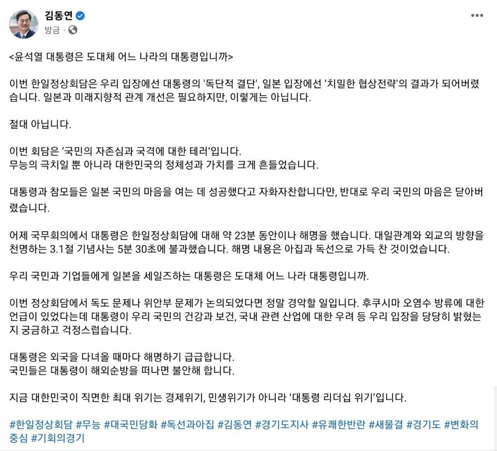 김 지사는 22일 자신의 사회관계망 서비스(SNS)를 통해 "이번 한일정상회담은 우리 입장에선 대통령의 '독단적 결단', 일본 입장에선 '치밀한 협상전략'의 결과가 되어버렸다"며 "일본과 미래지향적 관계 개선은 필요하지만, 이렇게는 절대 아니다"고 주장했다.