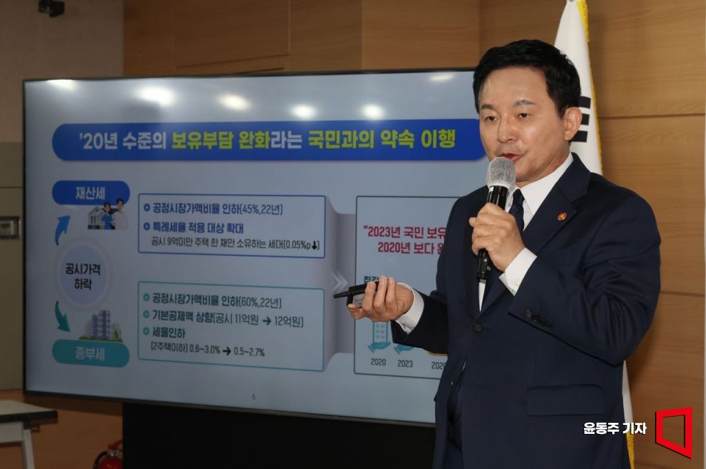 원희룡 국토교통부 장관이 22일 서울 종로구 정부서울청사에서 2023년 공동주택 공시가격 산정 결과를 브리핑을 하고 있다. 사진=윤동주 기자 doso7@