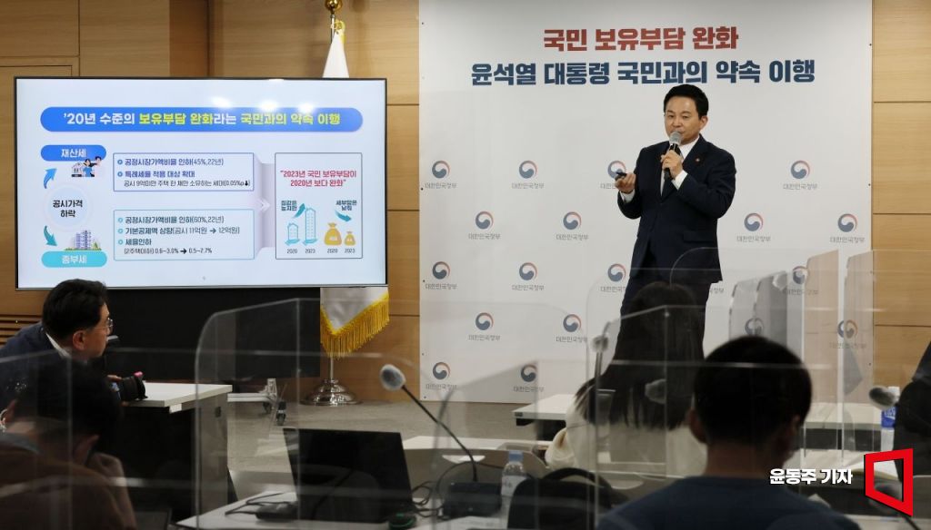 원희룡 국토교통부 장관이 22일 서울 종로구 정부서울청사에서 2023년 공동주택 공시가격 산정 결과를 브리핑을 하고 있다. 사진=윤동주 기자 doso7@