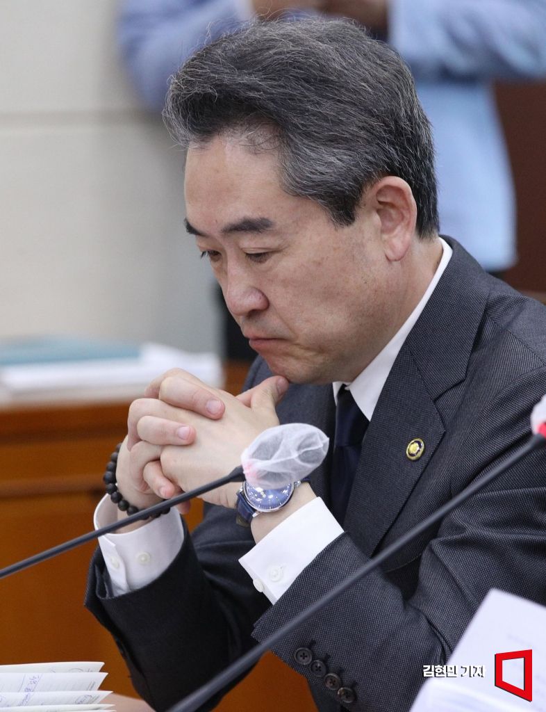 윤희근 경찰청장이 22일 국회에서 열린 행정안전위원회 전체회의에서 생각에 잠겨 있다. 사진=김현민 기자 kimhyun81@