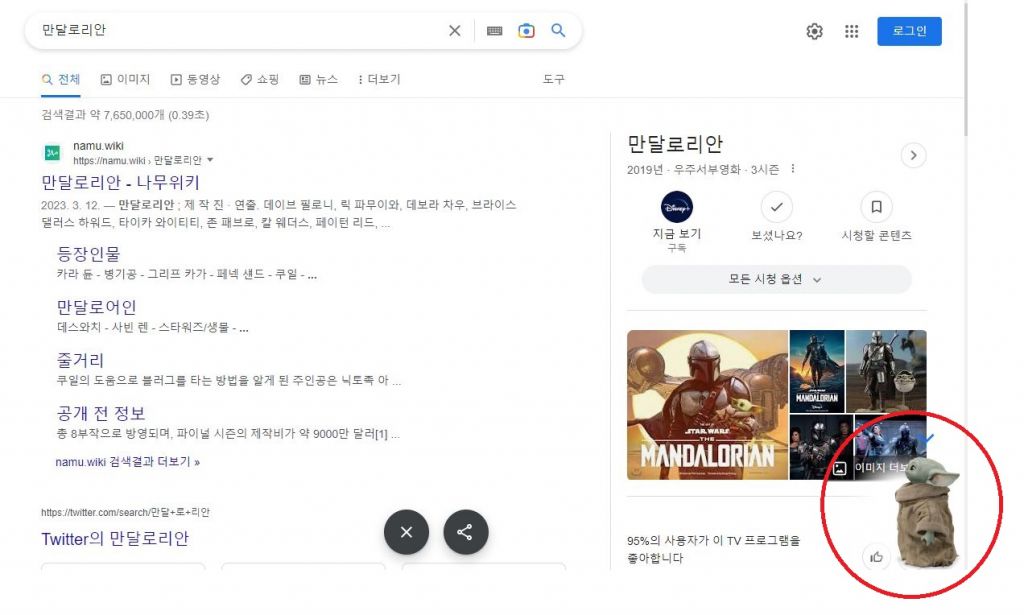 22일 현재 구글 검색창에 '만달로리안'을 검색하면 웹페이지 하단에 드라마 주연 캐릭터 중 한 명인 '그로구'가 등장한다.
