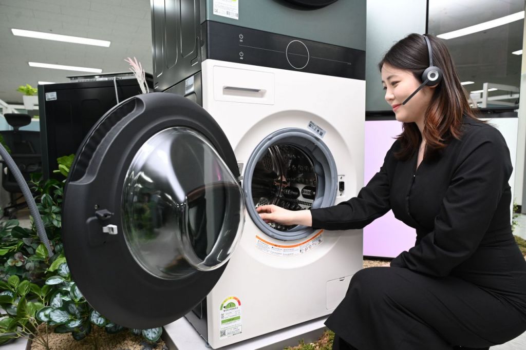하이텔레서비스가 밸런스 근무제로 생긴 사무실 여유 공간을 더욱 일하기 좋은 환경으로 개선했다. 사진은 사무실 공간 내 설치된 'LG 오브제컬렉션 체험존'에서 제품을 직접 체험하며 고객과 상담 중인 상담 컨설턴트의 모습. [사진제공=LG전자]