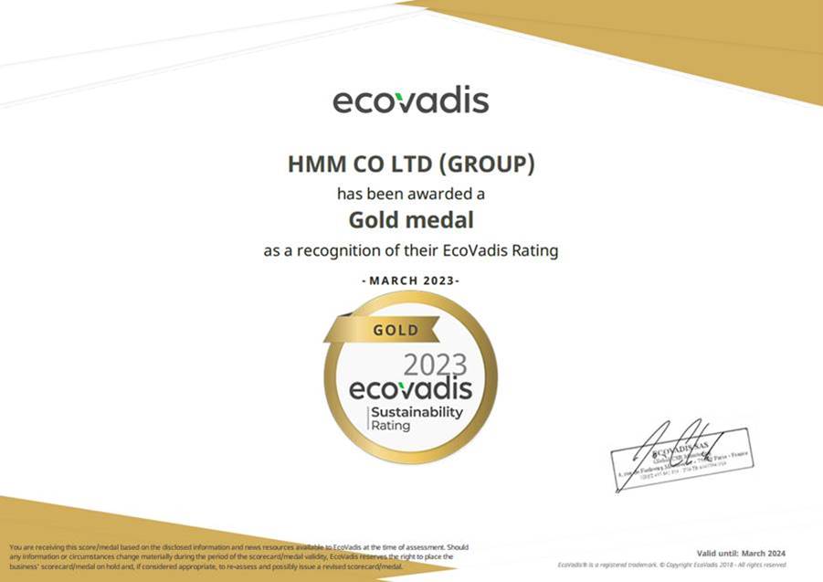 HMM은 에코바디스(EcoVadis)의 ESG 평가에서 2년 연속 '골드’ 등급을 획득했다고 23일 밝혔다.