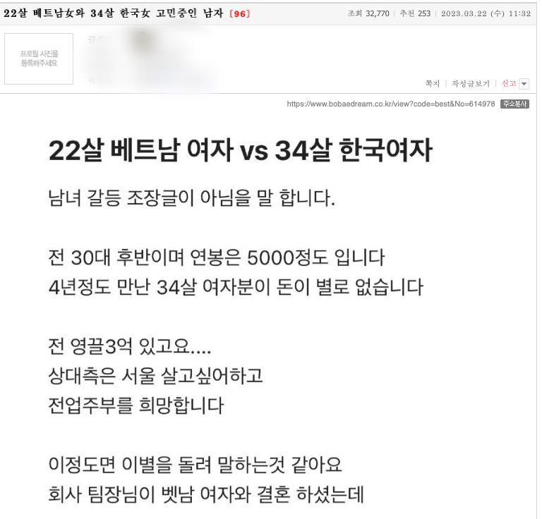 22일 온라인 커뮤니티 보배드림에는 "22살 베트남 여자와 34살 한국 여자 고민 중인 남자"라는 제목의 사연이 올라왔다. 자신을 30대 후반 직장인이라고 소개한 A 씨는 두 여자 사이에서 고민하고 있다고 털어놓았다.