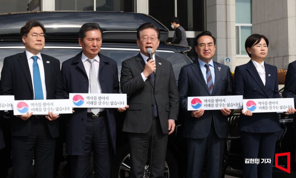 이재명 더불어민주당 대표가 22일 국회 본청 앞에서 열린 대일굴종외교 규탄 태극기달기 운동 행사에서 발언하고 있다. 사진=김현민 기자 kimhyun81@