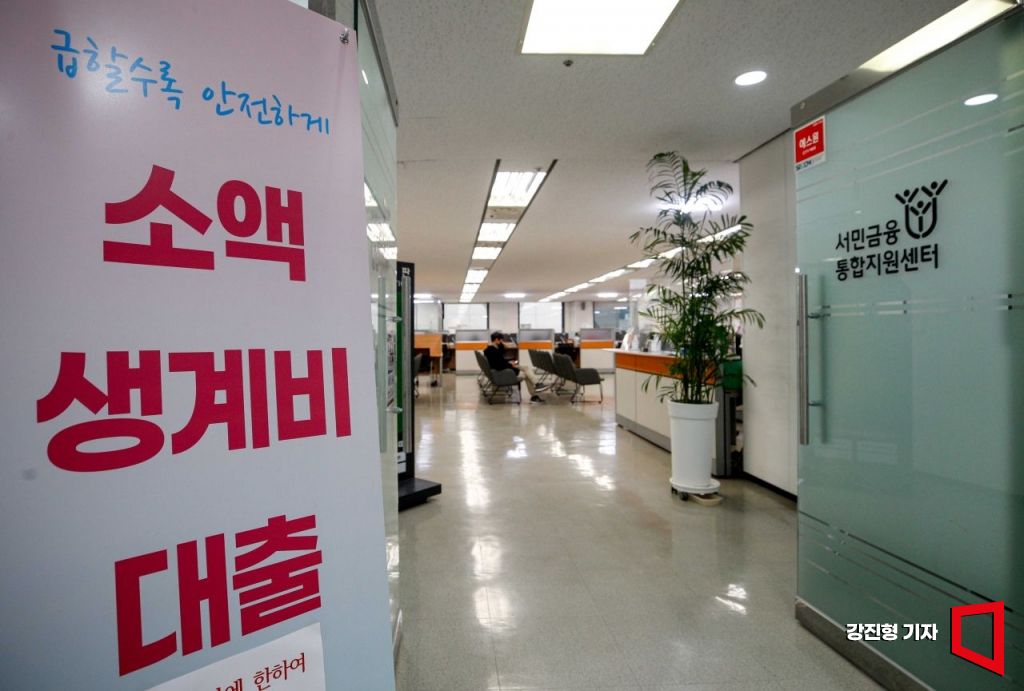 긴급 생계비 사전 예약이 시작되며 신청자가 폭주한 가운데 23일 서울 중구 중앙서민금융통합지원센터 입구에 소액 생계비 대출 문구가 적힌 안내문이 세워져 있다. 사진=강진형 기자aymsdream@