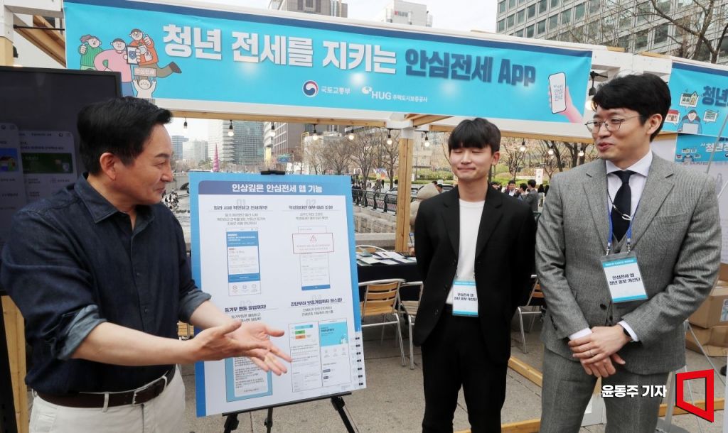원희룡 국토교통부 장관이 23일 서울 종로구 청계천 일대에서 열린 ‘청년 전세사기 예방을 위한 현장 캠페인’ 현장을 방문, 중계업자들에게 안심전세 앱 관련 브리핑을 받고 있다. 사진=윤동주 기자 doso7@