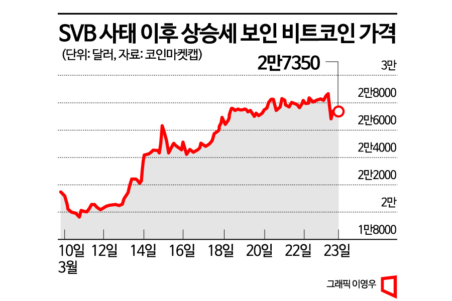 23일 글로벌 가상자산 시황 중계 사이트 코인마켓캡에 따르면 SVB 파산 사태가 본격화된 이달 10일 이후 비트코인 가격은 오름세를 보이기 시작했다. 1만9000달러대이던 가격은 이날 오후 2시5분 기준 2만7350달러(약 3504만원)까지 상승했다. 해당 기간 동안 비트코인 가격은 40% 넘게 급등했다. 전날에는 2만8700달러를 웃돌기도 했다. 다만 3월 연방공개시장위원회(FOMC) 정례회의에서 연방준비제도(Fed)가 기준금리를 0.25%포인트 인상하고 제롬 파월 Fed 의장이 올해 금리 인하 가능성에 대해 "인하를 예상하지 않고 있다"고 말하면서 이날 약세를 보였다.