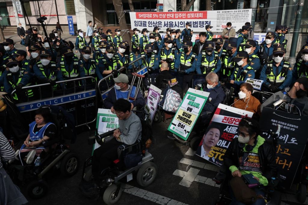 23일 전장연은 이날 오전 8시부터 서울 지하철 1호선 시청역에서 지하철 지연 시위에 나섰다. 지난 1월20일 서울 지하철 삼각지역에서 시위를 벌인 이후 62일 만이다. 이들은 지하철 탑승을 시도했지만 경찰과 지하철 보안관의 저지로 막혔다. 다만 출근길에 시민들과 경찰, 취재진 등이 엉키면서 지하철 운행은 2~3분가량 지연됐다.