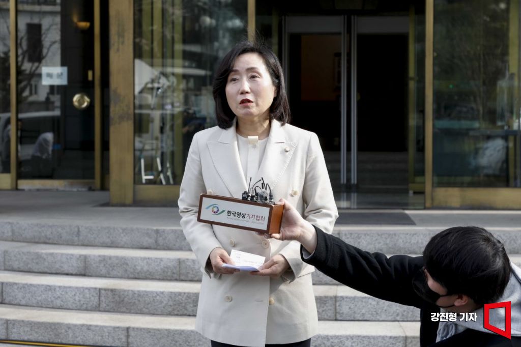 헌법재판소가 지난해 국회 본회의를 통과한 '검수완박'(검찰 수사권 완전 박탈)법에 대해 표결 과정에서 위헌적 요소는 있었지만 최종적으로 무효는 아니라는 판결을 내린 23일 서울 헌법재판소 앞에서 전주혜 국민의힘 의원이 입장을 밝히고 있다. 사진=강진형 기자aymsdream@