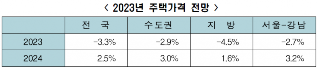 올해 주택 가격은 전국 3.3%, 수도권 2.9%, 지방은 4.5% 하락할 전망이다. 서울 강남 3구도 2.7% 가격 하락이 예상된다. 내년에는 전국 기준 2.5% 가격 상승으로 회복세를 보일 수 있다. 수도권은 3.0%, 지방은 1.6%, 강남 3구는 3.2% 가격 상승이 예상된다.