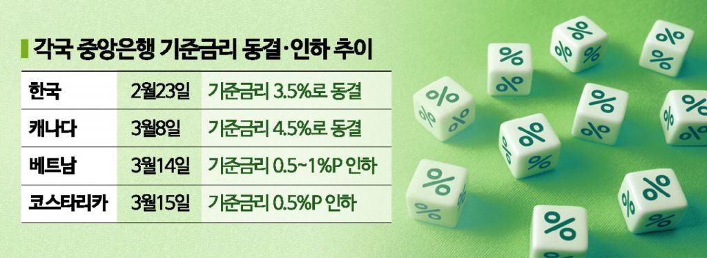 일부 국가는 금리를 동결하고 있다. 주요 7개국(G7) 중에선 캐나다 중앙은행이 처음으로 이달 기준금리를 4.5%로 동결하며 금리인상 중단을 공식화했다.