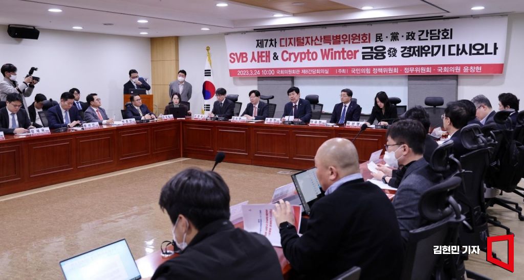 윤창원 국민의힘 의원이 24일 국회 의원회관에서 'SVB사태&크립토윈터, 금융발 경제위기 다시 오나' 주제로 열린 디지털자산특별위원회 민당정 간담회에서 발언하고 있다. 사진=김현민 기자 kimhyun81@