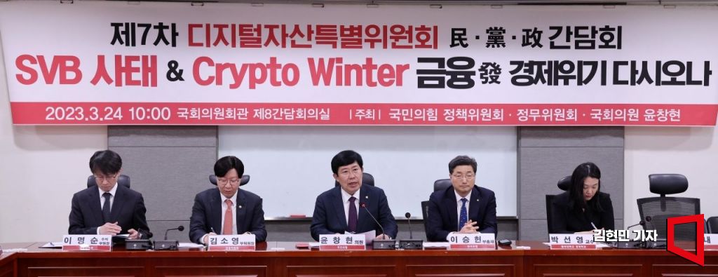 윤창현 국민의힘 의원이 24일 국회 의원회관에서 'SVB사태&크립토윈터, 금융발 경제위기 다시 오나' 주제로 열린 디지털자산특별위원회 민당정 간담회에서 발언하고 있다. 사진=김현민 기자 kimhyun81@