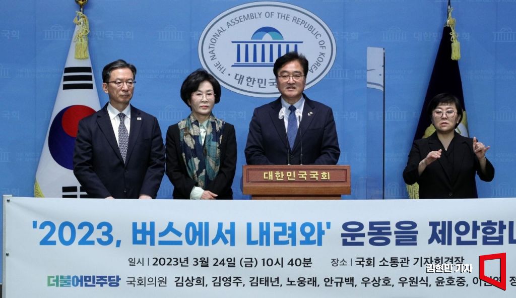 더불어민주당 4선 중진 의원들이 24일 서울 여의도 국회 소통관에서 현안 관련 기자회견을 열고 '2023, 버스에서 내려와' 운동을 제안하고 있다. 왼쪽부터 정성호, 김상희, 우원식 의원. 사진=김현민 기자 kimhyun81@