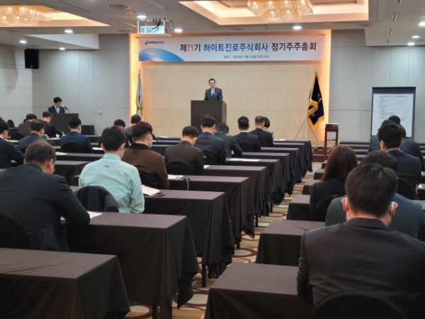 김인규 하이트진로 대표이사 사장이 24일 서초구 더케이호텔에서 열린 주주총회에서 발언하고 있다.[사진제공=하이트진로]