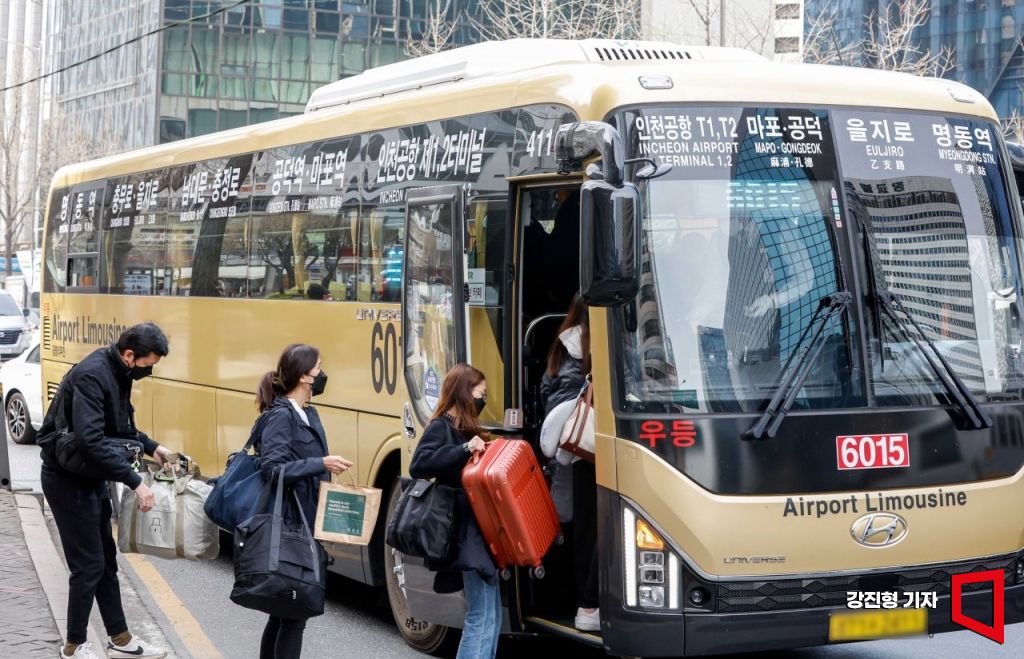 코로나19로 막혔던 하늘길이 다시 열리면서 서울지역 공항버스 이용객이 1년 만에 17배로 급증한 24일 서울 중구 을지로입구역 인근 공항버스 정류장에서 외국인 관광객들이 버스에 탑승하고 있다.