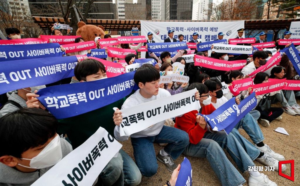 24일 서울 중구 청계한빛광장에서 열린 '학교폭력-사이버폭력 예방 대국민 비폭력 캠페인'에서 참가자들이 '학교폭력 OUT'을 촉구하는 퍼포먼스를 펼치고 있다. 사진=강진형 기자aymsdream@