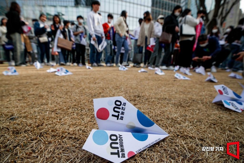 24일 서울 중구 청계한빛광장에서 열린 '학교폭력-사이버폭력 예방 대국민 비폭력 캠페인'에서 참가자들이 '학교폭력 OUT'을 촉구하는 퍼포먼스를 펼치고 있다. 사진=강진형 기자aymsdream@