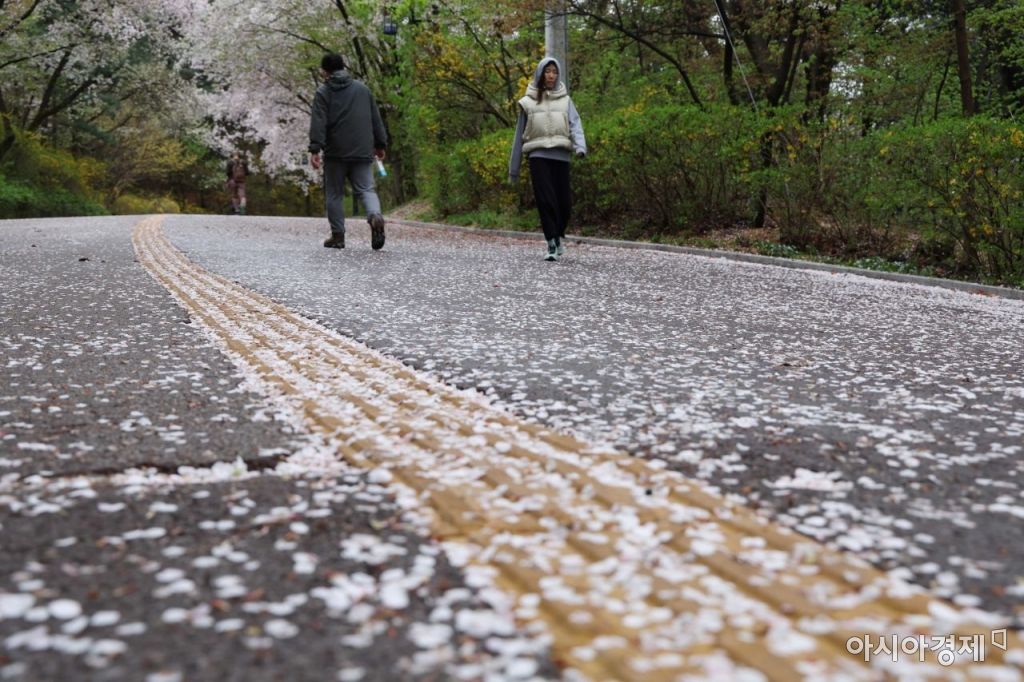 비가 내린 13일 서울 남산 산책로에 벚꽃잎이 떨어져 있다. /문호남 기자 munonam@