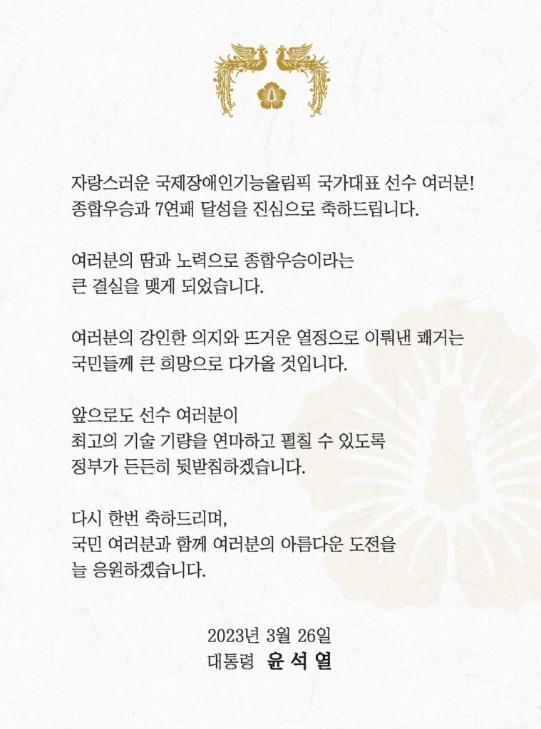특히 윤 대통령은 "여러분의 땀과 노력으로 종합우승이라는 큰 결실을 맺게 됐다"며 "앞으로도 선수 여러분이 최고의 기술·기량을 연마하고 펼칠 수 있도록 정부가 든든히 뒷받침하겠다"고 강조했다. 그러면서 "국민 여러분과 함께 여러분의 아름다운 도전을 늘 응원하겠다"고 덧붙였다.