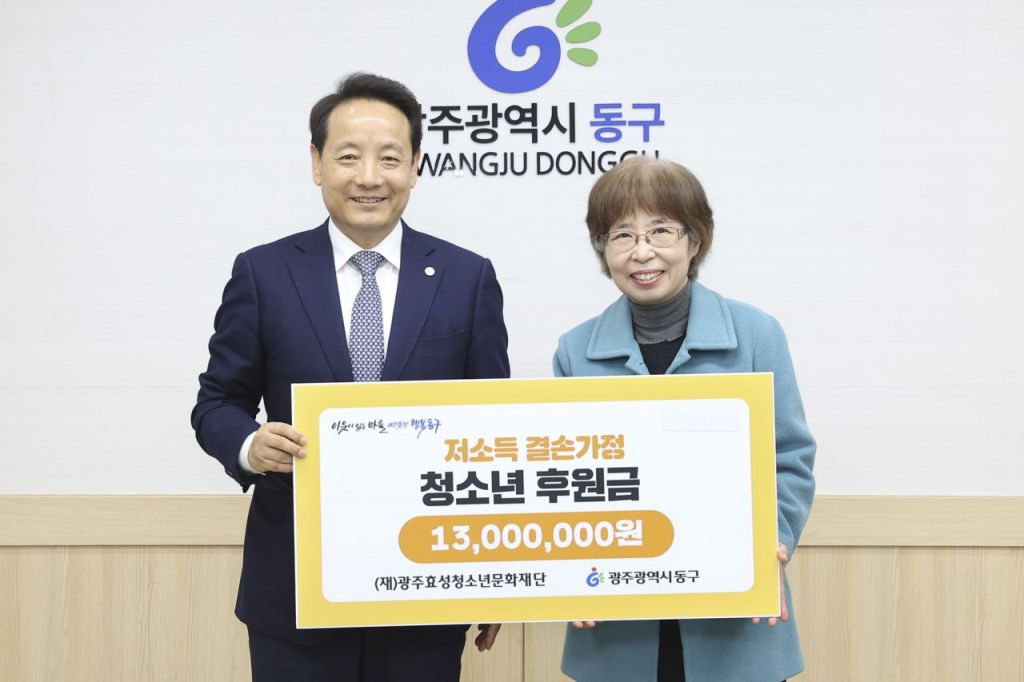 광주광역시 동구는 최근 광주효성청소년문화재단으로부터 지역 인재 육성·발굴을 위해 사용해달라며 후원금 1300만 원을 기탁받았다고 26일 밝혔다.