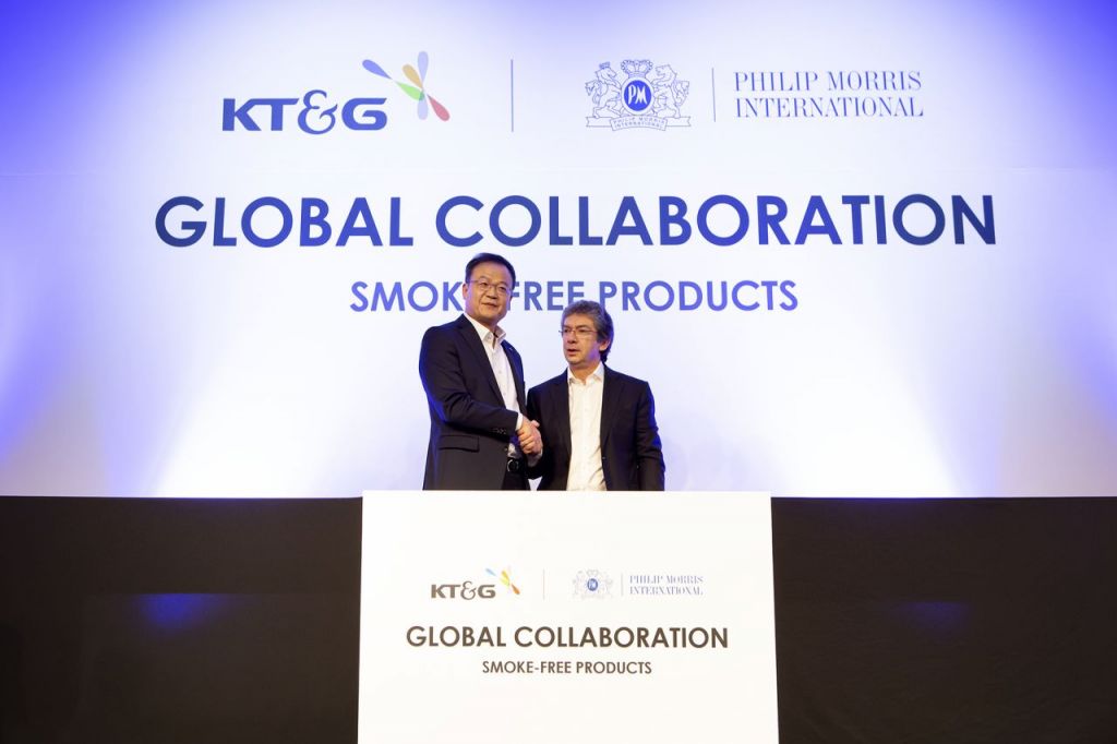 백복인 KT&G 사장(왼쪽)과 안드레 칼란조풀로스 PMI 최고경영자(오른쪽)가 최근 서울 광화문 포시즌스 호텔에서 글로벌 수출 관련 협약을 체결한 후 기념 사진을 촬영하고 있다.