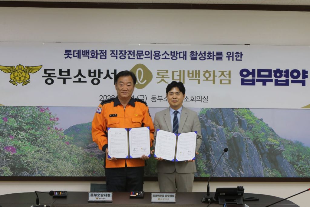 롯데백화점 광주점은 동부소방서와 직장 의용소방대 지원 및 재난 대응 협력관계 유지를 위한 업무협약을 체결했다고 27일 밝혔다.