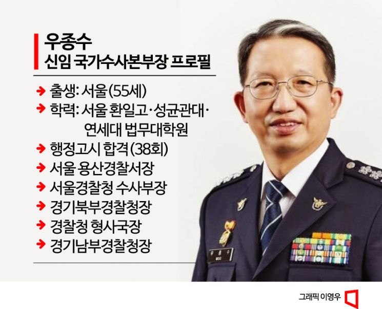 윤석열 대통령은 오는 29일 우 청장을 제2대 국수본부장으로 임명할 예정이라고 27일 밝혔다. 국수본부장은 전국 18개 시도경찰청장과 3만5000명의 전국 수사 경찰을 지휘하게 된다. 이로써 제1대, 2대 국수본부장은 모두 경찰 출신으로 채워지게 됐다.