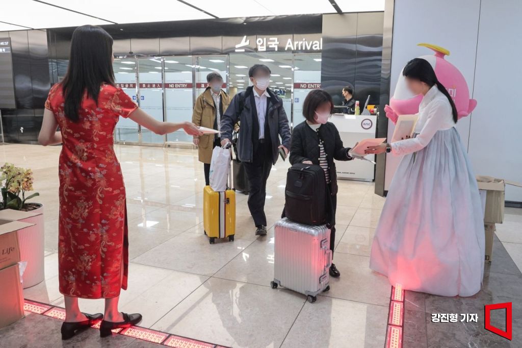 27일 오후 한국공항공사 관계자들이 김포공항에서 김포-북경·상해 노선 운항 재개를 기념해 입국하는 승객들에게 기념품을 나눠주고 있다.