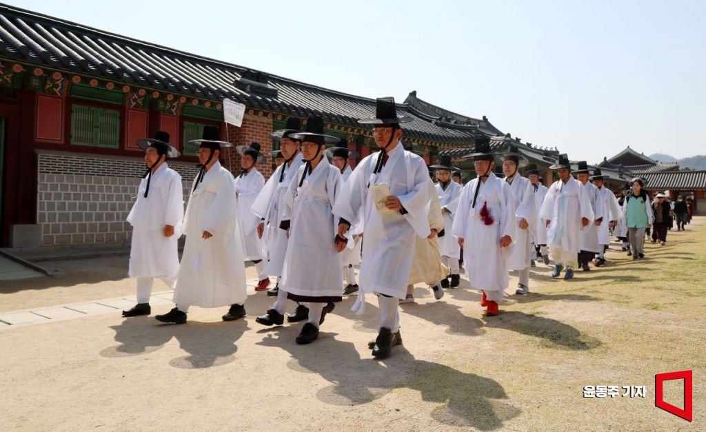 27일 서울 경복궁 사정전에서 열린 퇴계선생 귀향길 재현행사에 참석한 참가자들이 퇴계 이황의 '마지막' 귀향길'을 걷고 있다. 사진=윤동주 기자 doso7@
