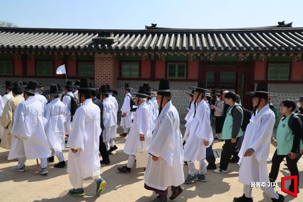 27일 서울 경복궁 사정전에서 열린 퇴계선생 귀향길 재현행사에 참석한 참가자들이 퇴계 이황의 '마지막' 귀향길'을 걷고 있다. 사진=윤동주 기자 doso7@