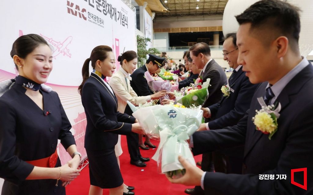 코로나19 사태로 중단된 김포-중국 노선 운항이 3년 만에 재개된 가운데 27일 김포국제공항 국제선 터미널에서 열린 ‘김포-북경·상해 노선 운항재개 기념식’에서 윤형중 한국공항공사 사장 등이 기장 및 승무원에게 꽃다발을 증정하고 있다.
