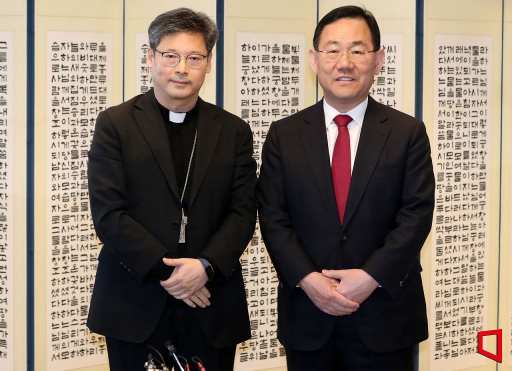 주호영 국민의힘 원내대표가 27일 오후 서울 중구 서울대교구청에서 서울대교구장 정순택 대주교를 예방해 기념촬영을 하고 있다. 사진=국회사진기자단